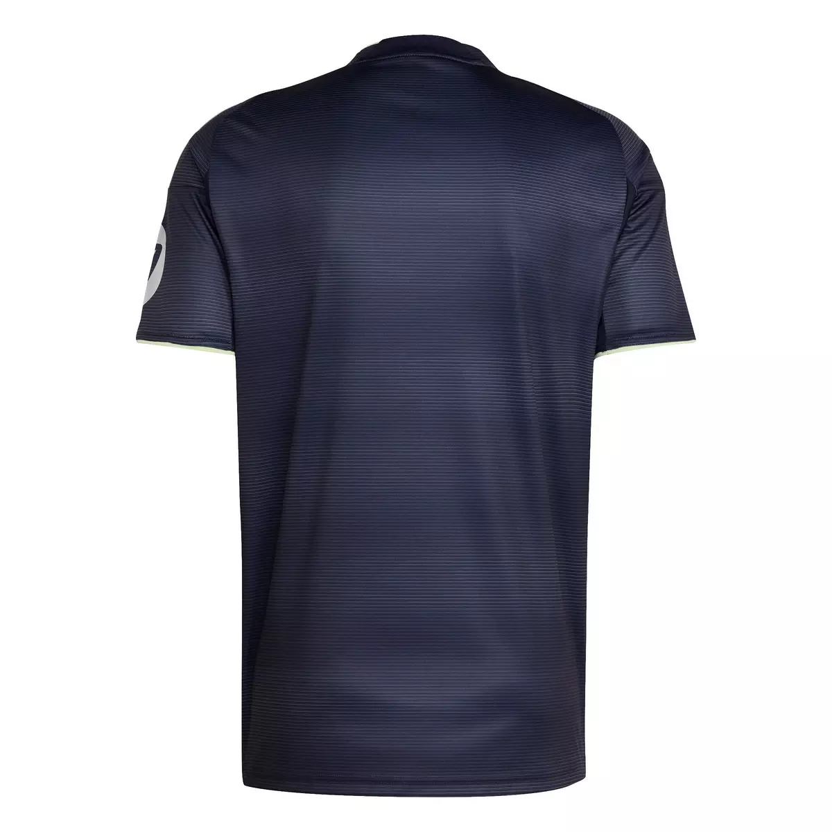 Unleash your passion with the new Real Madrid Away Jersey 25/26, the must-have piece of Real Madrid merchandise for the season. Manufactured by adidas, this Real Madrid football shirt is drenched in the official color Legend Ink (a deep, dark blue) with striking silver and light-volt accents. The unique design features a subtle moiré effect that pays homage to the breathtaking, futuristic facade of the renovated Santiago Bernabéu stadium under the floodlights, ensuring your Real Madrid jersey 25/26 connects you to the magic of the club’s home, wherever you are.
